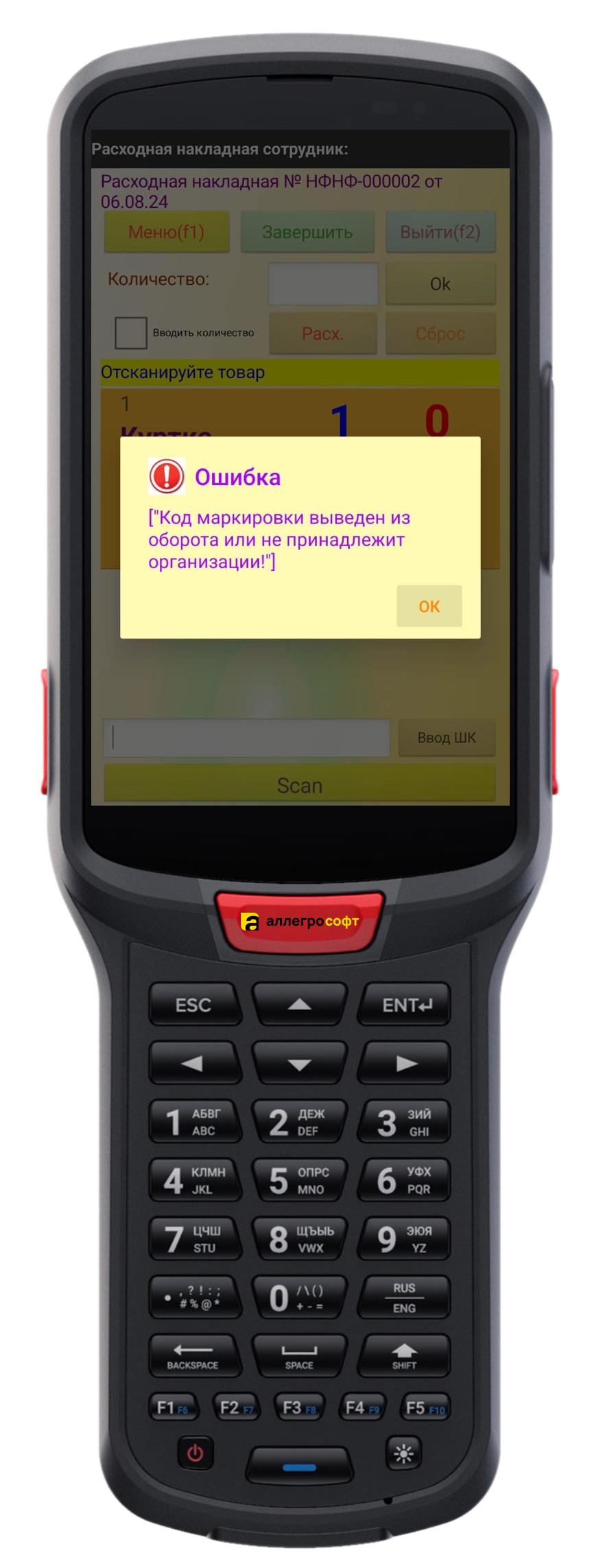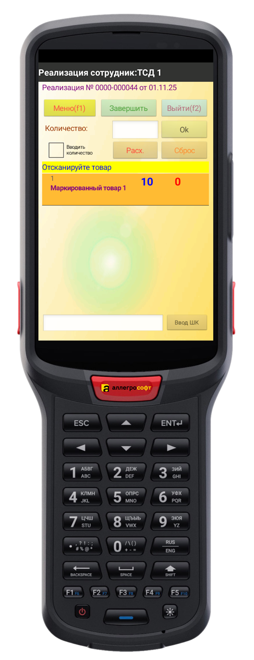 Добавление с помощью терминала сбора данных кодов в «Реализацию»,