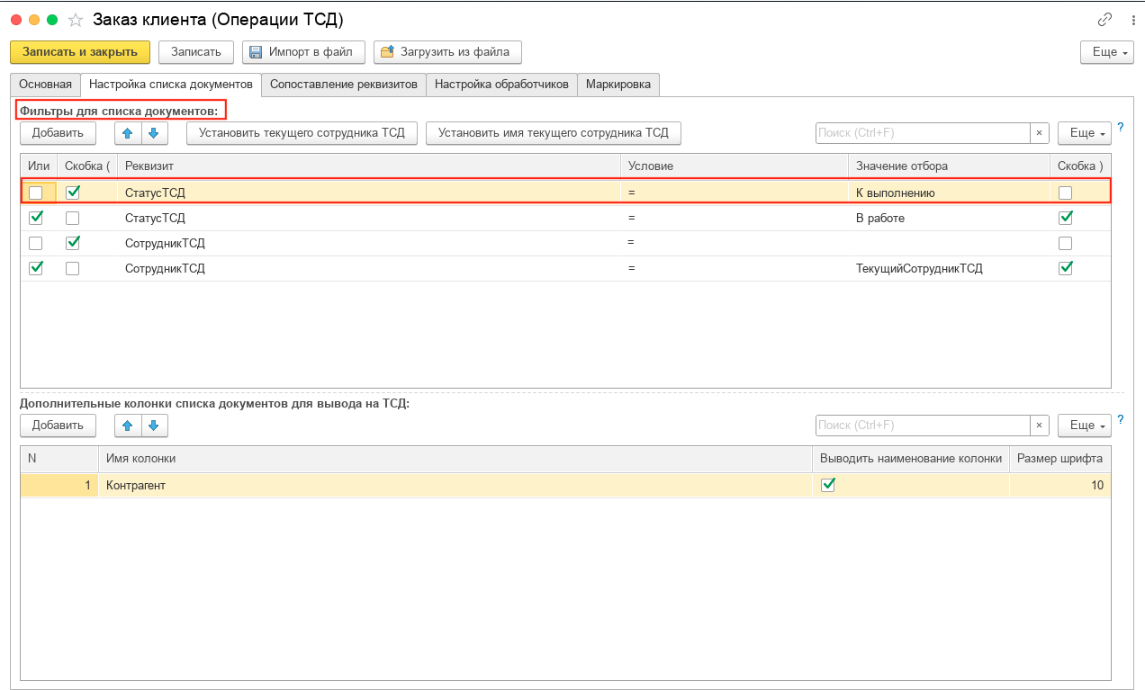Отображаются заказы с состоянием «К выполнению» или «В работе» если поле Сотрудник ТСД пустое или заполнено или текущим.