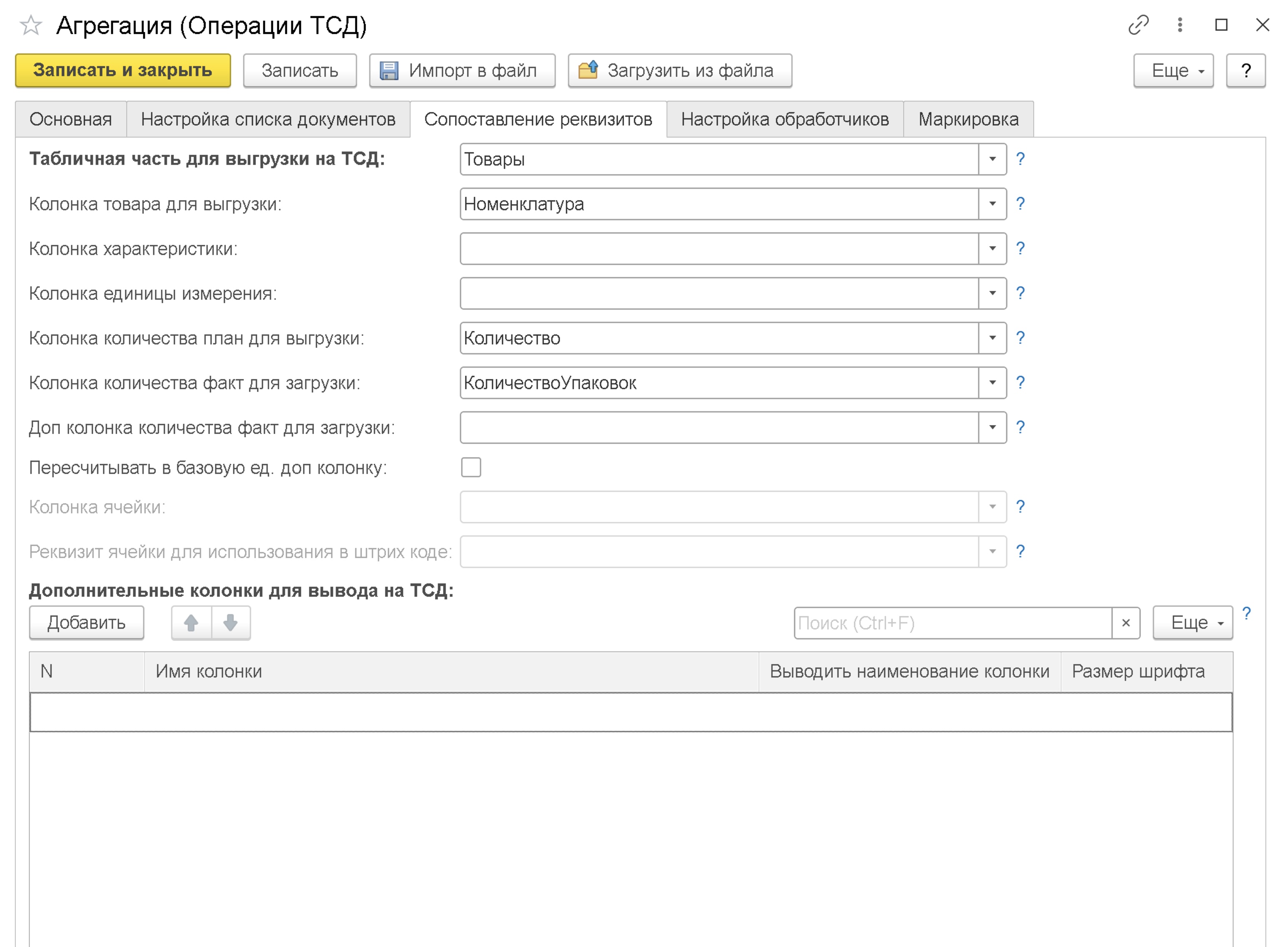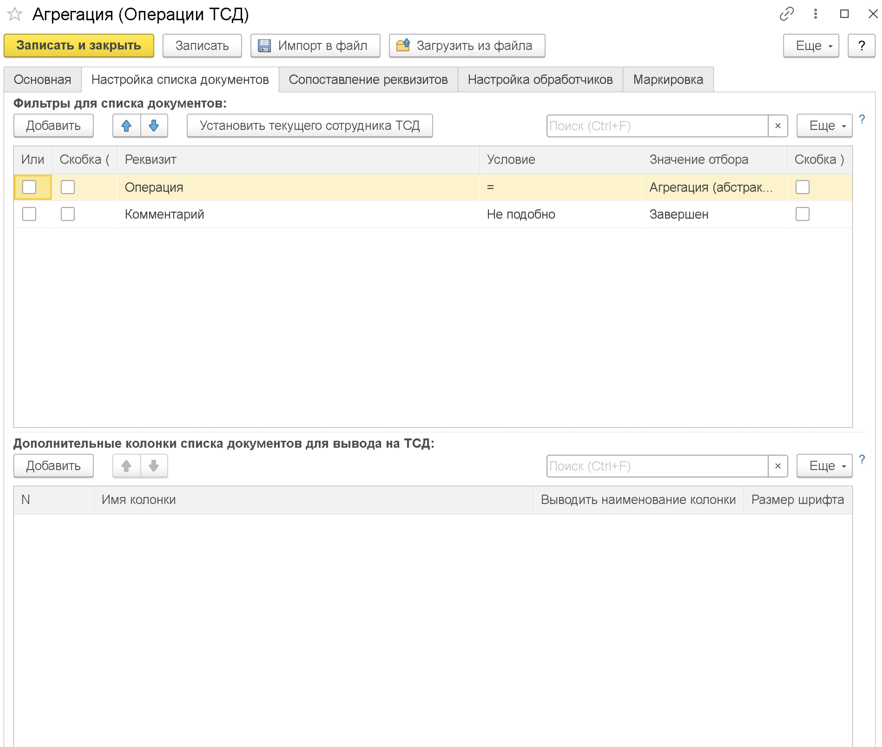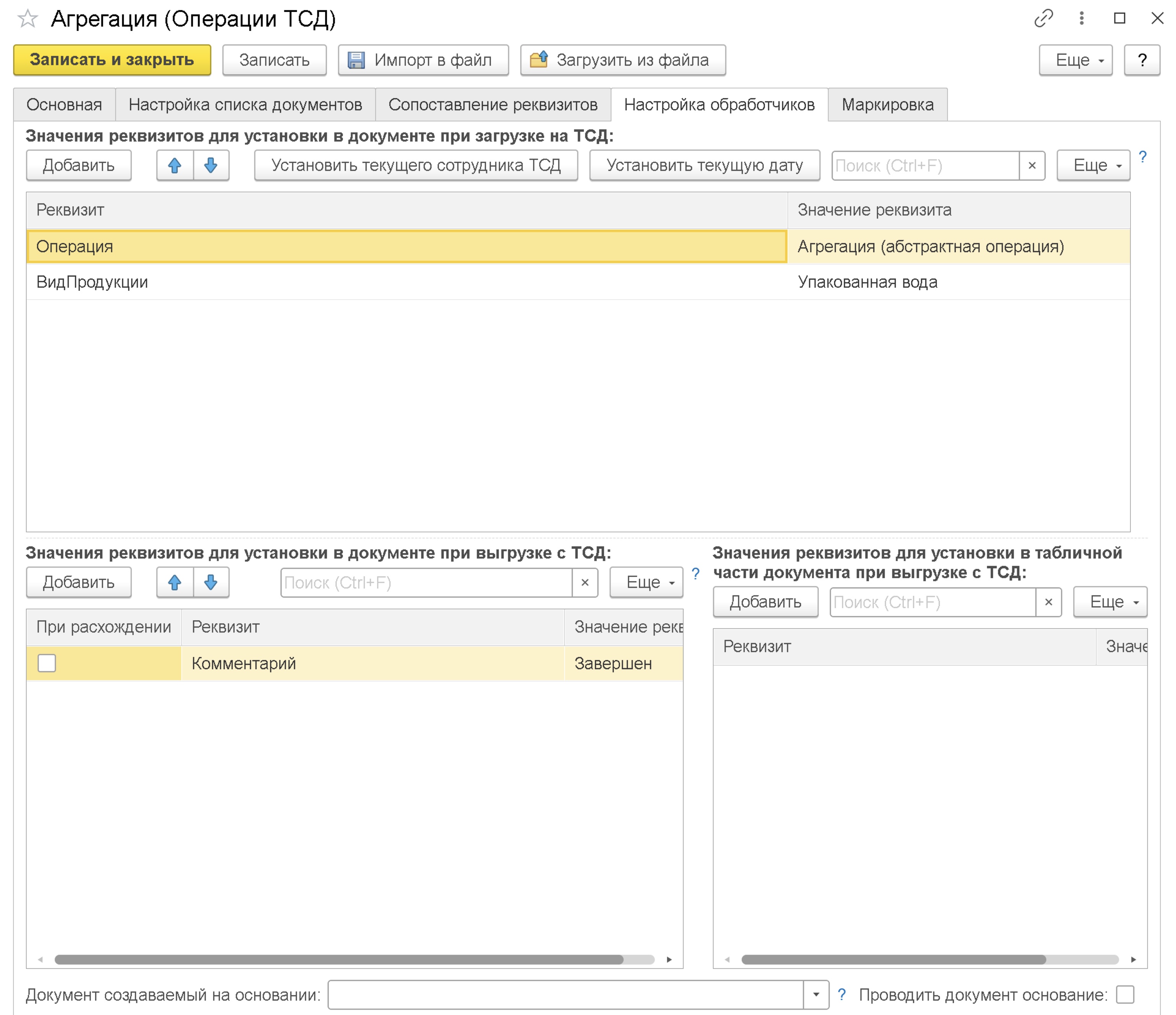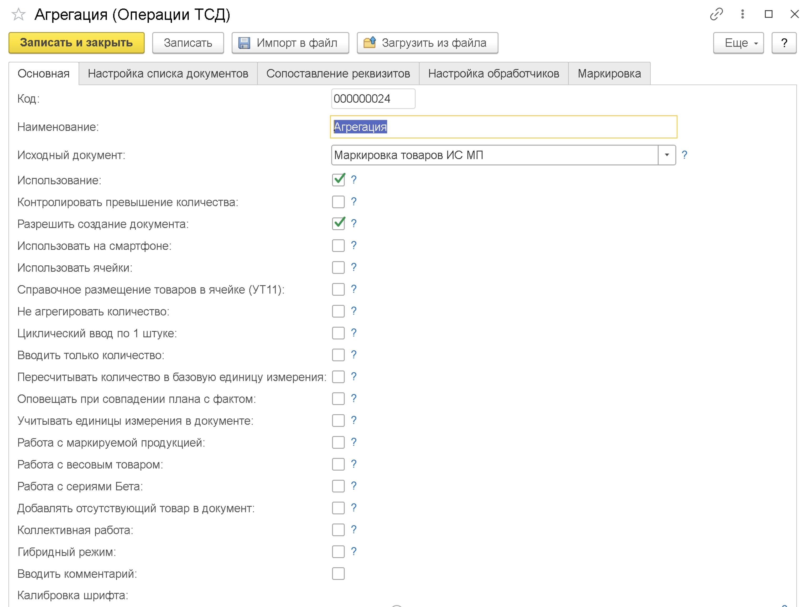 Настройки операции ТСД для создания документа «Маркировка товаров ИС МП» с видом операции «Агрегация (абстрактная операция)».
