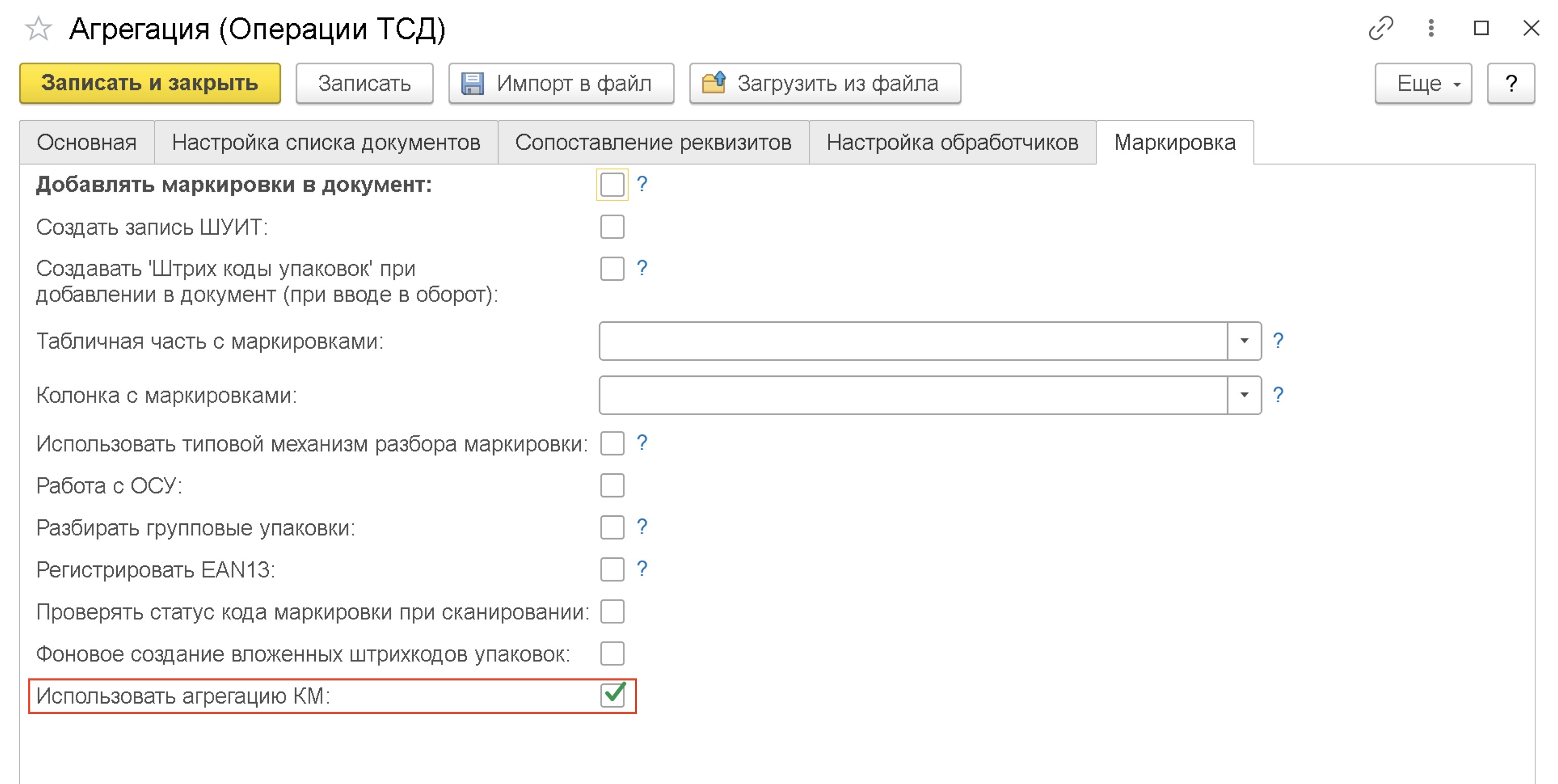Необходимо активировать «Использовать агрегацию КМ» на вкладке «Маркировка».